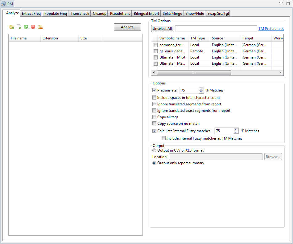 : You will need to add at least one translation memory (TM) before analyzing files. To add a local or remote TM, click TM Preferences. Go to Creating or opening a TM for more information. You can click in the TM Options column header to sort the TMs in ascending or descending order. You can unselect all chosen TMs by clicking Unselect All.