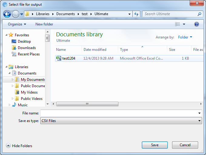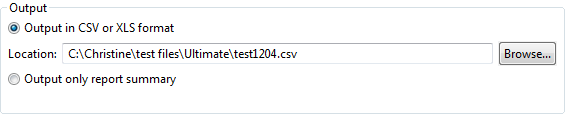 Output in CSV or XLS format: Select this option and click Browse to select a location and provide a file name as shown in the example below.
