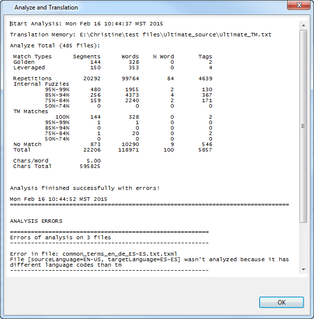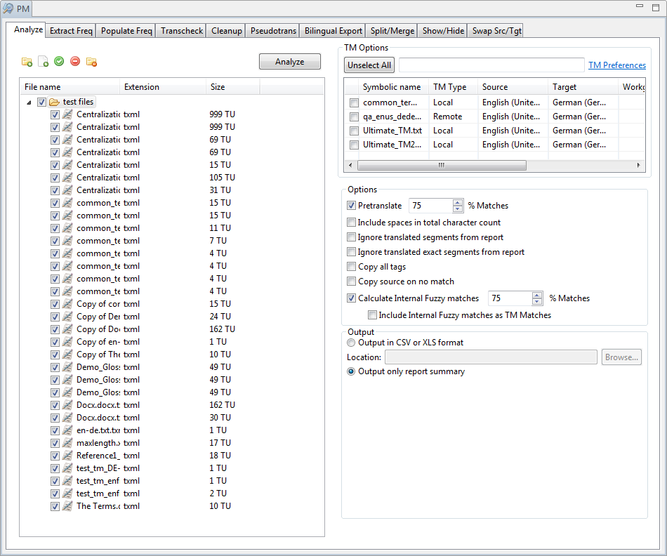 The analyzed TXML files are saved in the same folder as the source files. According to the output report format, either a CSV file is saved at the chosen location or the Analysis and Translation report appears as shown below. The report for files analyzed against separate TMs appears in separate tabs.