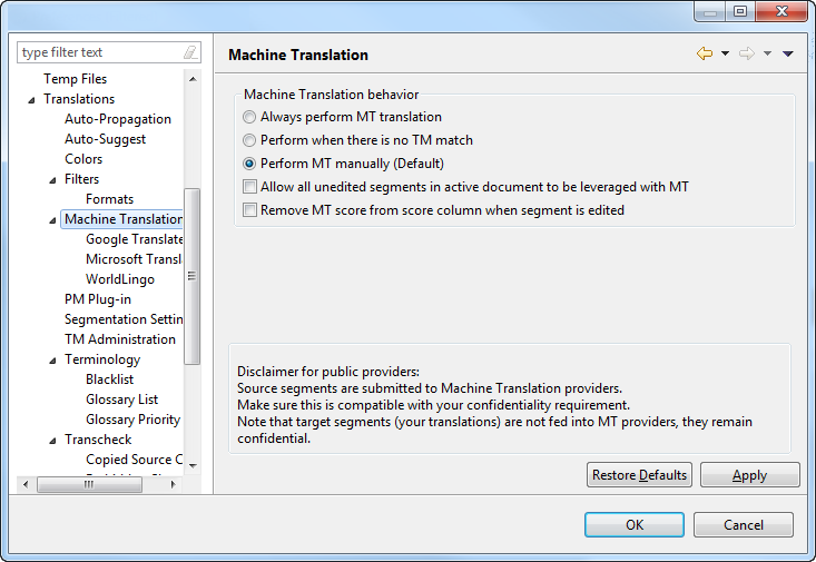 The Machine Translation Preferences dialog box appears.