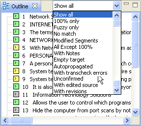 The Outline window is used for source segment navigation. The source for each translatable segment is listed with color-coded icons that represent the translation score. The segments that need to be confirmed are also marked by an asterisk (*) in the Outline window. Find below an example of an Outline window: